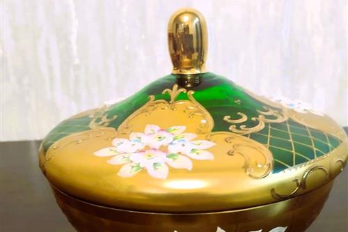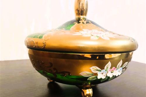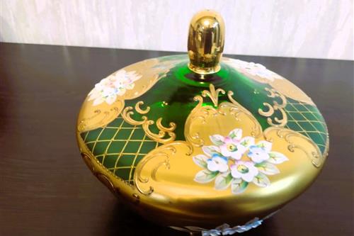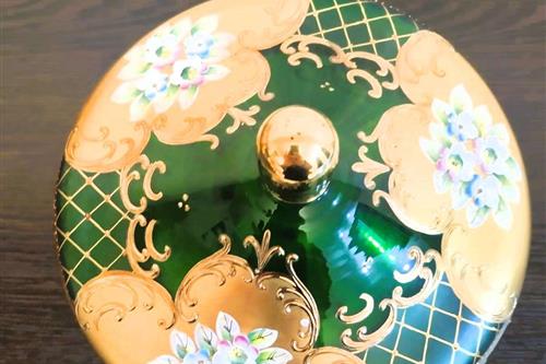 ყიდება ჩეხური წარმოების ბოჰემური შუშის (Bohemia) საკოლექციო ზარდახშა (ბონბონიერა). დამზადებულია მუქი მწვანე ზურმუხტისფერი მინისგან, რომელიც დაფარულია 24-კარატიანი ოქროთი. გაფორმებულია "როკოკოს" სტილის მოცულობითი ხელით ნაძერწი ყვავილებით. არის იდეალურ მდგომარეობაში, ყოველგვარი დაზიანებისა და ოქროს ცვეთის გარეშე. საუკეთესო შენაძენია სამკაულების შესანახად ან საჩუქრად.
