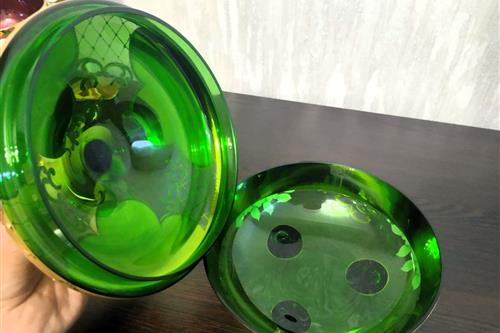 მასალა: ორშრიანი ზურმუხტისფერი მინა (ბოჰემური კრისტალი), მდიდარი 24 კარატიანი ოქროს მოოქროვილი.