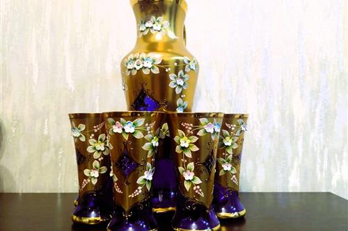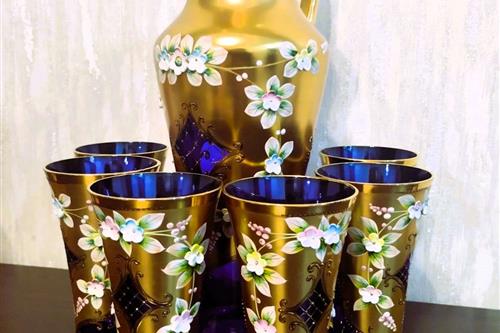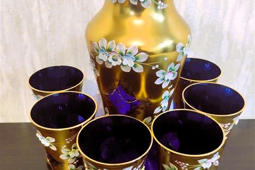 იყიდება ჩეხოსლოვაკიური წარმოების ბოჰემური შუშის (Bohemia) საკოლექციო ნაკრები. კომპლექტში შედის მაღალი გრაფინი და 6 ჭიქა. დამზადებულია მუქი ლურჯი (კობალტისფერი) მინისგან, რომელიც დაფარულია 24-კარატიანი ოქროთი. გაფორმებულია "როკოკოს" სტილის მოცულობითი ხელით ნაძერწი ყვავილებით. ნაკრები არის იდეალურ მდგომარეობაში, ყოველგვარი დაზიანებისა და ოქროს ცვეთის გარეშე. საუკეთესო შენაძენია ინტერიერის დეკორისა თუ საჩუქრისთვის