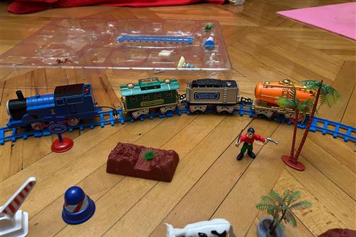 ან მაგიდაზე ან იატაკზე ლიანდაგები და მატარებელი, მუშაობს ბატარეიჯებზე
