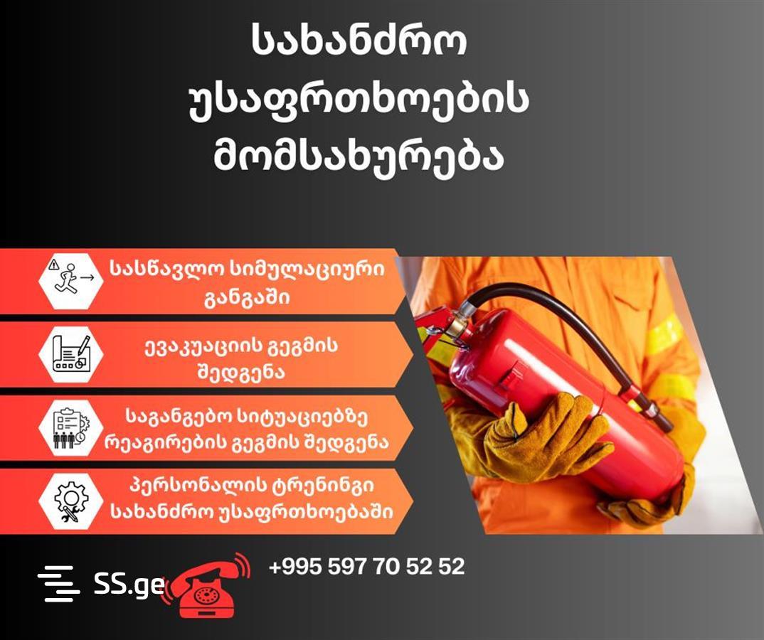 🧑🚒სახანძრო ექსპერტების ჯგუფი გთავაზობთ სახანძრო უსაფრთხოების სრულ სერვისს, მათ შორის: საევაკუაციო გეგმების მომზადება, სახანძრო სწავლება, სიმულაციური სასწავლო გავარჯიშება, სახანძრო დოკუმენტაციის მოწესრიგება არსებული სტანდარტების შესაბამისად.