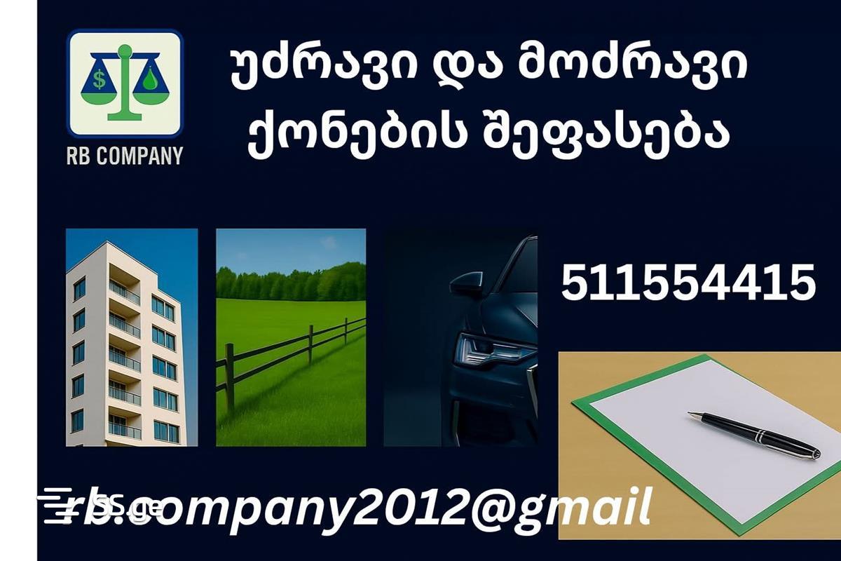 შეფასება 100 ლარიდან - ქონების შეფასება — 12 წლიანი გამოცდილებით! გთავაზობთ უძრავი და მოძრავი ქონების პროფესიონალურ შეფასებას საქართველოს მასშტაბით, მათ შორის უცხოელი მოქალაქეებისთვის ბინადრობის უფლების მისაღებად საჭირო შეფასებებს. დაგვიკავშირდით ვოცაპზე ან მობილურზე 511554415 RB Company provides professional valuation services for real estate and movable assets across Georgia. We specialize in property appraisals for foreign nationals applying for residence permits, as well as valuations for banking, legal, and official purposes. Our services include appraisal of apartments, houses, land plots, commercial properties, machinery, equipment, and other movable assets. All valuation reports are prepared in accordance with International Valuation Standards (IVS), ensuring accuracy, transparency, and reliability. (whatsapp 511554415) Show original