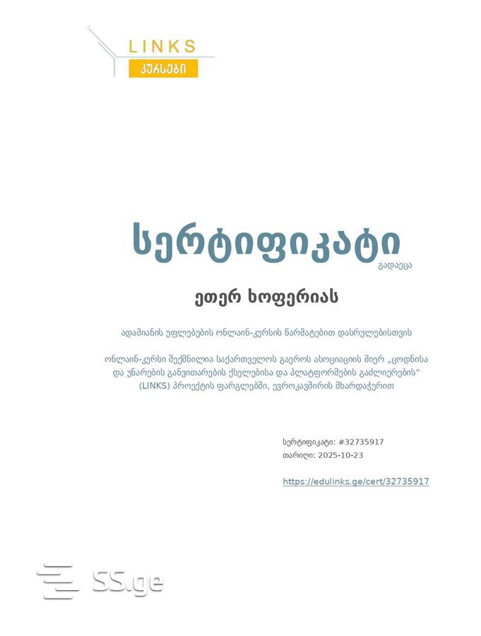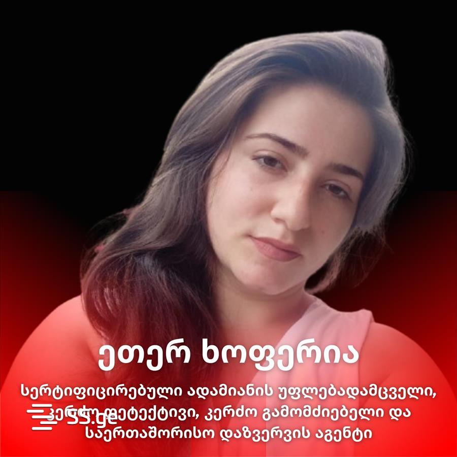 ეთერ ხოფერია — ადამიანის უფლებების დამცველი, კერძო დეტექტივი, კერძო გამომძიებელი და საერთაშორისო დაზვერვის აგენტი ლანჩხუთში. იგი საერთაშორისოდ სერტიფიცირებულია და მხარდაჭერილია ევროკავშირის, ევროსაბჭოს, გაეროსა და მრავალი სხვა საერთაშორისო ორგანიზაციის მიერShow original