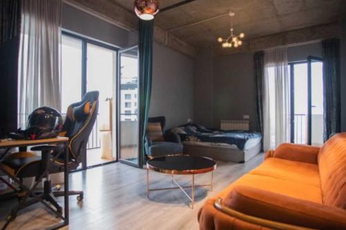იყიდება ახალ აშენებულ შესახლებულ კორპუსში მიხეილ ბურძგლას ქუჩაზე 2 ოთახიანი სტუდიოს ტიპის ბინა ავეჯით და ტექნიკით.