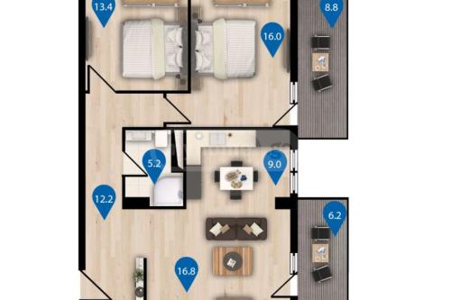 უცხოვრებელი, გარემონტებული ბინა ავეჯით, ტექნიკით (გაზქურა, ღუმელი, გამწივი). ყველა ოთახი ცალკე დამცველზე, სათავსო ოთახით (2 კვ), ცენტრალური გათბობის ქვაბიც დამონტაჟებულია. ზალას ცალკე ფანჯარა არ აქვს, ორივე საძინებლის კარი გადის აივანზე, აქვს ფანჯარა. იდეალური ადგილი, გურამიშვილის და ღრმაღელის მეტროებს შორის, ცენტრალური გზიდან 30 მეტრში, კოლეჯთან. ბინა არ არის იპოთეკით დატვირთული
